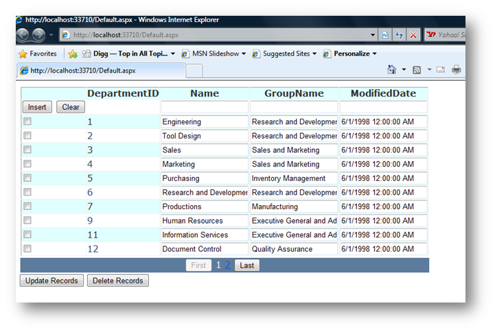 | <div> <asp:ListView ID="ListView1" runat="server"DataKeyNames="DepartmentID" DataSourceID="LinqDataSource1"InsertItemPosition="FirstItem"> <ItemTemplate> <tr style="background-color: #E0FFFF;color: #333333;"> <td> <asp:CheckBox ID="CheckBox1" runat="server" /> </td> <td> <asp:Label ID="DepartmentIDLabel1" runat="server" Text='<%# Eval("DepartmentID") %>' /> </td> <td> <asp:TextBox ID="NameTextBox" runat="server" Text='<%# Bind("Name") %>' /> </td> <td> <asp:TextBox ID="GroupNameTextBox" runat="server" Text='<%# Bind("GroupName") %>' /> </td> <td> <asp:TextBox ID="ModifiedDateTextBox" runat="server" Text='<%# Bind("ModifiedDate") %>' /> </td> </tr> </ItemTemplate> <EmptyDataTemplate> <table runat="server" style="background-color: #FFFFFF;border-collapse:collapse;border-color: #999999;border-style:none;border-width:1px;"> <tr> <td> No data was returned.</td> </tr> </table> </EmptyDataTemplate> <InsertItemTemplate> <tr style=""> <td> <asp:Button ID="InsertButton" runat="server"CommandName="Insert" Text="Insert" /> <asp:Button ID="CancelButton" runat="server"CommandName="Cancel" Text="Clear" /> </td> <td> </td> <td> <asp:TextBox ID="NameTextBox" runat="server" Text='<%# Bind("Name") %>' /> </td> <td> <asp:TextBox ID="GroupNameTextBox" runat="server" Text='<%# Bind("GroupName") %>' /> </td> <td> <asp:TextBox ID="ModifiedDateTextBox" runat="server" Text='<%# Bind("ModifiedDate") %>' /> </td> </tr> </InsertItemTemplate> <LayoutTemplate> <table runat="server"> <tr runat="server"> <td runat="server"> <table ID="itemPlaceholderContainer" runat="server"border="1" style="background-color: #FFFFFF;border-collapse:collapse;border-color: #999999;border-style:none;border-width:1px;font-family: Verdana, Arial, Helvetica, sans-serif;"> <tr runat="server" style="background-color: #E0FFFF;color:#333333;"> <th runat="server"> </th> <th runat="server"> DepartmentID</th> <th runat="server"> Name</th> <th runat="server"> GroupName</th> <th runat="server"> ModifiedDate</th> </tr> <tr ID="itemPlaceholder" runat="server"> </tr> </table> </td> </tr> <tr runat="server"> <td runat="server" style="text-align: center;background-color: #5D7B9D;font-family: Verdana, Arial, Helvetica, sans-serif;color:#FFFFFF"> <asp:DataPager ID="DataPager1" runat="server"> <Fields> <asp:NextPreviousPagerField ButtonType="Button"ShowFirstPageButton="True" ShowNextPageButton="False" ShowPreviousPageButton="False"/> <asp:NumericPagerField /> <asp:NextPreviousPagerField ButtonType="Button"ShowLastPageButton="True" ShowNextPageButton="False" ShowPreviousPageButton="False"/> </Fields> </asp:DataPager> </td> </tr> </table> </LayoutTemplate> <EditItemTemplate> <tr style="background-color: #999999;"> <td> <asp:Button ID="UpdateButton" runat="server"CommandName="Update" Text="Update" /> <asp:Button ID="CancelButton" runat="server"CommandName="Cancel" Text="Cancel" /> </td> <td> <asp:Label ID="DepartmentIDLabel1" runat="server" Text='<%# Eval("DepartmentID") %>' /> </td> <td> <asp:TextBox ID="NameTextBox" runat="server" Text='<%# Bind("Name") %>' /> </td> <td> <asp:TextBox ID="GroupNameTextBox" runat="server" Text='<%# Bind("GroupName") %>' /> </td> <td> <asp:TextBox ID="ModifiedDateTextBox" runat="server" Text='<%# Bind("ModifiedDate") %>' /> </td> </tr> </EditItemTemplate> <SelectedItemTemplate> <tr style="background-color: #E2DED6;font-weight:bold;color: #333333;"> <td> <asp:Button ID="DeleteButton" runat="server"CommandName="Delete" Text="Delete" /> <asp:Button ID="EditButton" runat="server"CommandName="Edit" Text="Edit" /> </td> <td> <asp:Label ID="DepartmentIDLabel" runat="server" Text='<%# Eval("DepartmentID") %>' /> </td> <td> <asp:Label ID="NameLabel" runat="server" Text='<%# Eval("Name") %>' /> </td> <td> <asp:Label ID="GroupNameLabel" runat="server" Text='<%# Eval("GroupName") %>' /> </td> <td> <asp:Label ID="ModifiedDateLabel" runat="server" Text='<%# Eval("ModifiedDate") %>' /> </td> </tr> </SelectedItemTemplate> </asp:ListView> <asp:LinqDataSource ID="LinqDataSource1" runat="server" ContextTypeName="ListViewDemo.AdventureWorksDataContext"EnableDelete="True" EnableInsert="True" EnableUpdate="True"TableName="DemoLists"> </asp:LinqDataSource> <asp:Button ID="cmdUpdate" runat="server"onclick="Update_Click" Text="Update Records" /> <asp:Button ID="cmdDelete" runat="server"onclick="Delete_Click" Text="Delete Records" /> </div> |